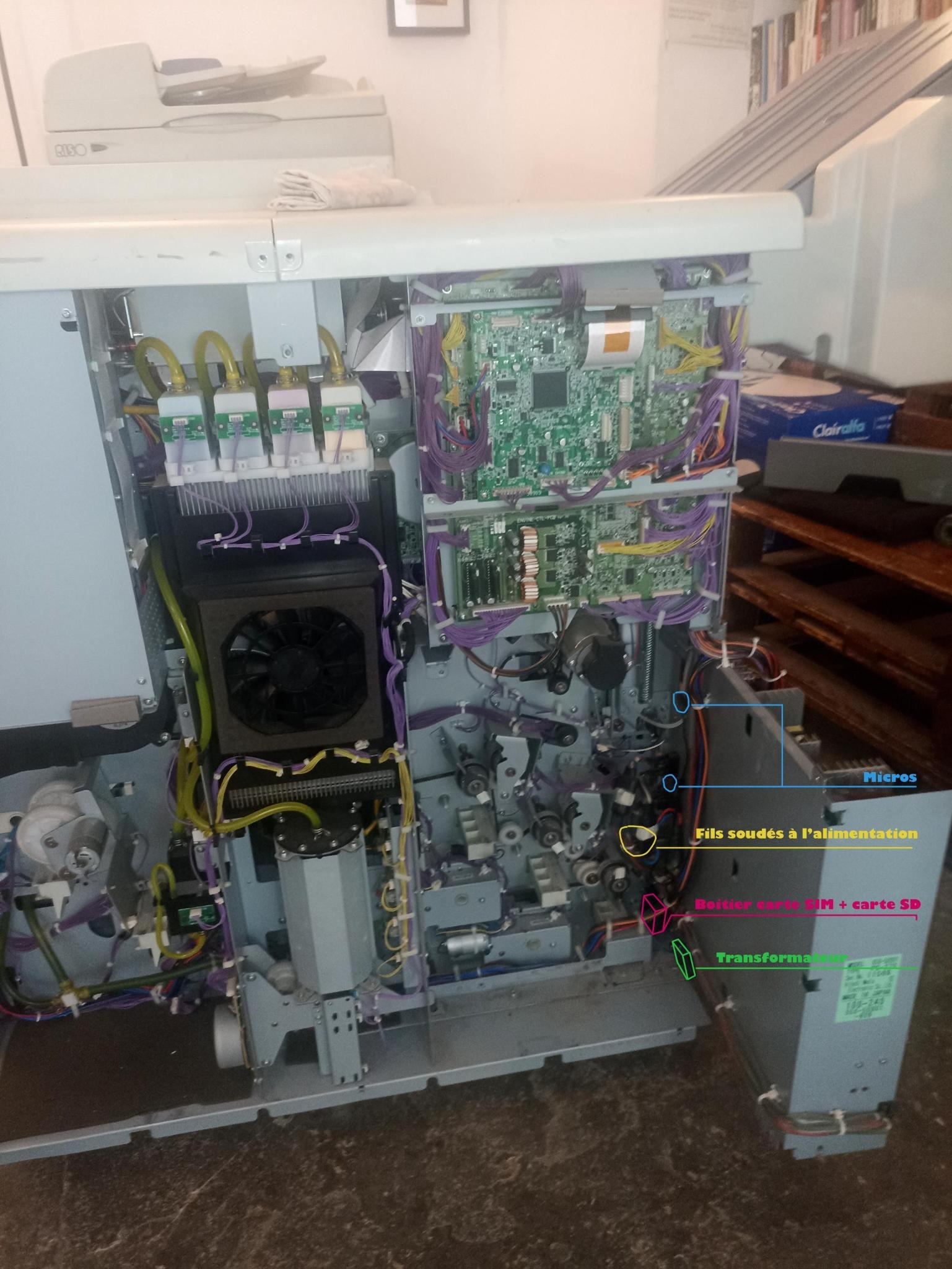 An audio surveillance device was found in an anarchist library. The device was hidden inside the printer-copier of the library. It included two microphones, an antenna, a transformer, a battery, a small box containing an electronic card, a 64 GB SD card, and a SIM card. According to the article that reported the discovery of the device, it was a surveillance device of model RB800 marketed by the Italian company Innova.