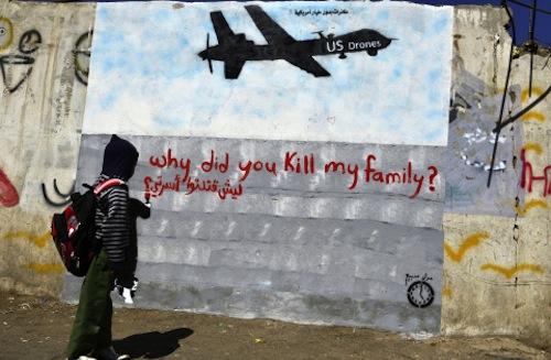 Niñe observando mural de drone estadounidense y texto en ingles: ¿por qué mataste a mi familia?, Yemen. Fuente: Yahya Arhab/EPA.