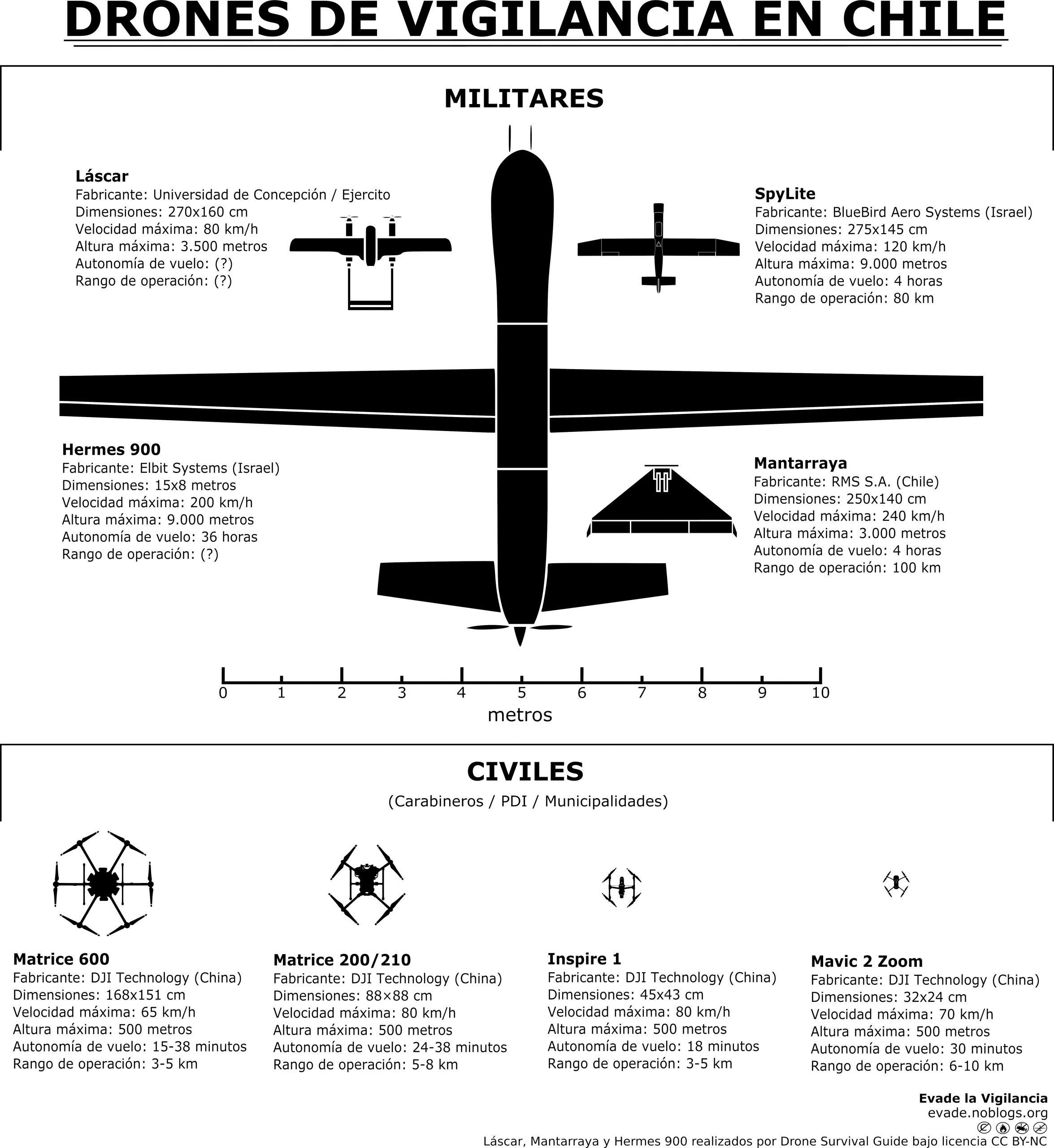 En Drone Survival Guide hay una infografía realizada por un artista visual holandés que recopila los drones más utilizados a nivel global, junto a algunas recomendaciones que podrían funcionar para ocultarse de los drones, como por ejemplo utilizar mantas térmicas para confundir las cámaras termales de los drones.