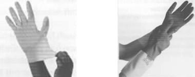 - Remove the first glove without letting it touch the packaging, grasping the glove only by the lower edge of the “sleeve” (not by the glove fingers!)