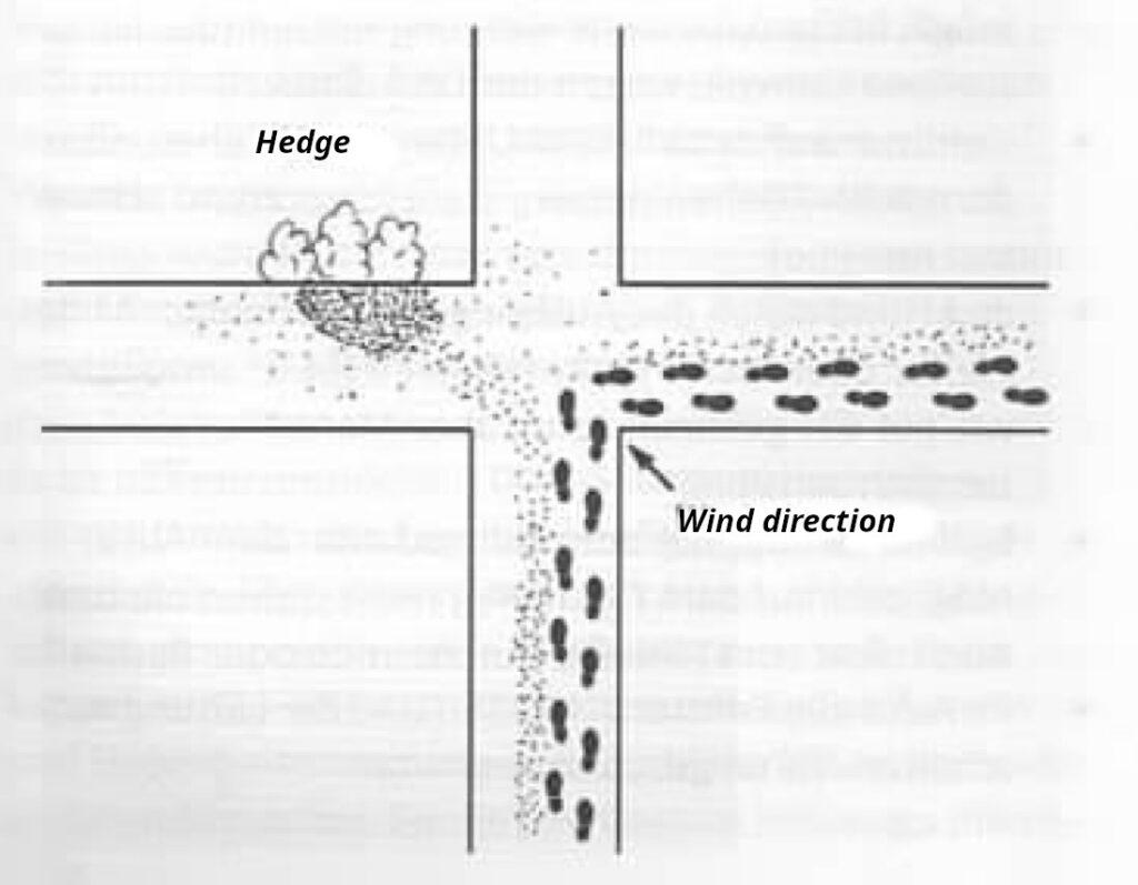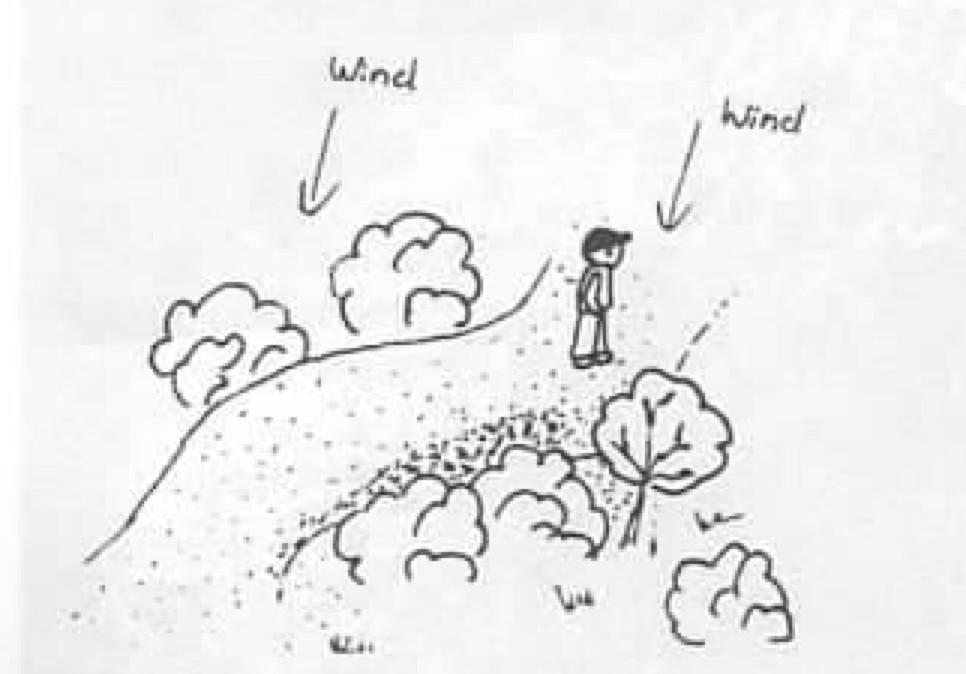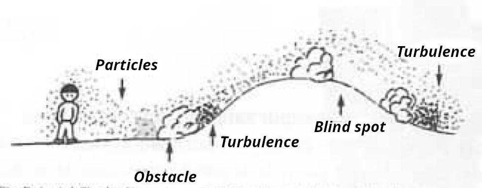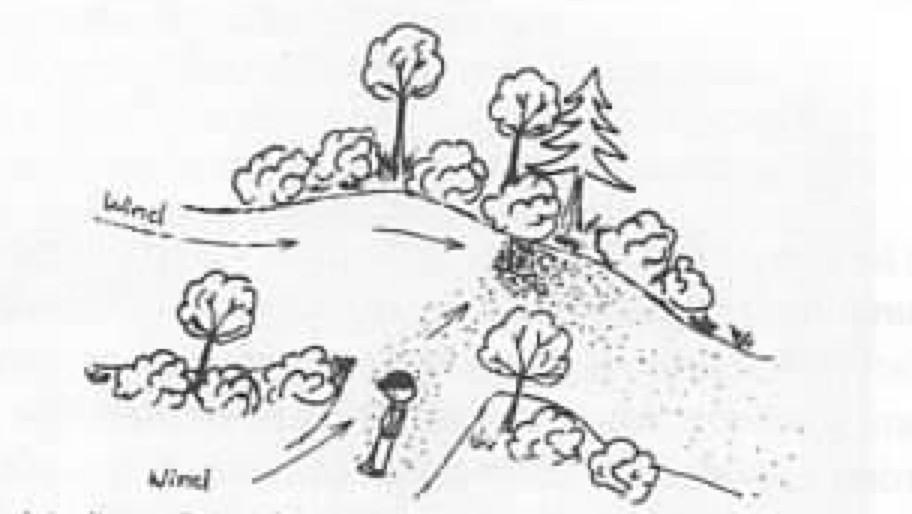 An example of how air current distribute odor particles. The spot labeled “turbulence” behind the first bush has the strongest odor, even though the person was never there. The spot labeled “blind spot” is where there is no odor.