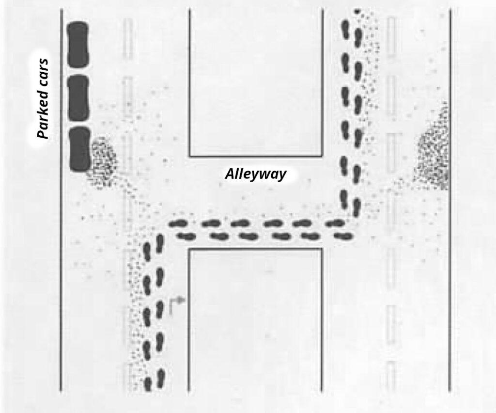 Such drifts are not the exception, but the rule. Wind, leaf blowers, and passing cars blow the particles away. Even the updraft generated by your own body heat means they don't simply fall vertically, but start by “sailing” through the air. Rain can also wash the particles away. Therefore, the trail is not straight — the dog has to smell where the particles are, and the human interprets a probable path. Or wind can blow the particles several hundred meters across a field so that they only remain in a furrow, or on a hot summer day an updraft can cause the particles to sail off again. Or rain washes the particles down a slope, causing them to remain in a place where the person being searched for has never been. Or you pause because you want to cross a road, and the waiting time causes many particles to fall away from you in one place and they blow into a cellar window. Then, the dog will indicate that the track leads there, and the cop will think: “Ah, maybe the person we're looking for was in this cellar.” Or maybe the tracks lie by the side of the road for days, and then a storm arrives that blows them far away.